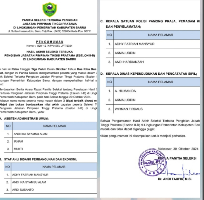 Para yang pejabat Pemkab Barru yang lolos tiga besar pada dua jabatan eselon II B yakni Kabag umum dan Keuangan Sekretariat DPRD Barru Andi Ika Syamsu Alam masuk tiga besar untuk formasi jabatan Asisten Administrasi Umum dan Staf Ahli Administrasi Pembangunan dan Ekonomi.